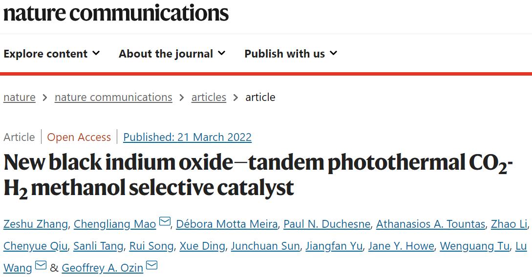 文献链接:New black indium oxide-tandem photothermal CO2-H2 methanol selective catalyst. Nat. Commun., 2022, DOI: 10.1038/s41467-022-29222-7.
