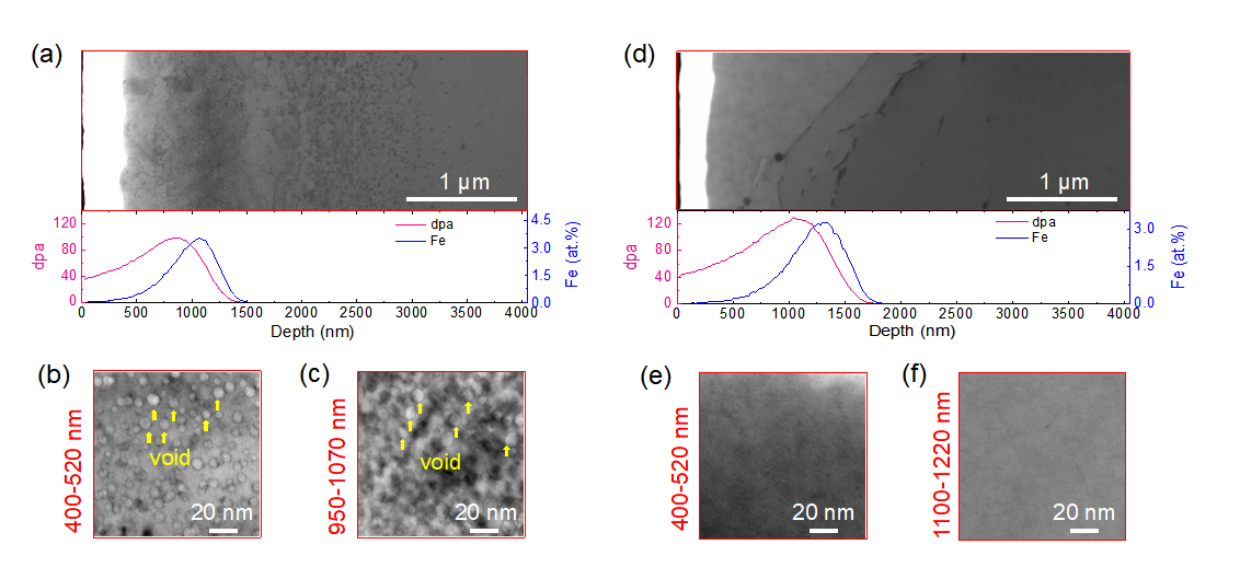 在3 MeV Fe离子,675 °C,~100 dpa的辐照条件下,纯Nb中产生了辐照引起的空洞,但在NbZrTi中未见可观测的空洞和位错环。对比纯Nb的肿胀温度区间(T/Tm:0.34 – 0.51),NbZrTi在该辐照温度下(T/Tm:0.48)的肿胀被抑制。NbZrTi中,由于低空位形成能而导致的高平衡空位浓度将有利于空洞在高温条件下的热释放;并且,点缺陷复合概率的增加也将有助于抑制辐照缺陷的累积。