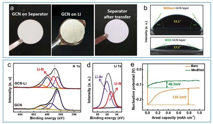 图11. (a)可转移的C3N4膜应用于Li负极修饰; (b)未修饰Li与C3N4-Li电极的电解液接触角对比; (c) Li盐处理前、后的C3N4的N 1s XPS谱图;(d) Li盐处理后的C3N4的Li 1s XPS谱图; (e) 使用未修饰Li与C3N4-Li电极的非对称电池成核过电位对比。