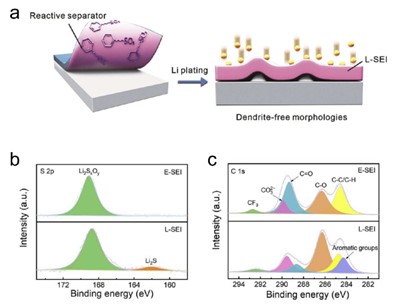 图12. (a) 基于磺化木素的功能性隔膜,及其诱导形成的L-SEI对Li沉积行为的作用示意图; (b, c)电解液诱导的E-SEI与功能隔膜诱导的L-SEI S 2p 与C 1s XPS谱图对比。
