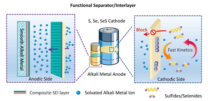 与传统锂离子电池相比,碱金属-硫(硒)电池有望提供相对较高的能量密度,并被认为是具有前景的下一代新型储能电池。以Li-S电池为例,基于双电子反应机理 (S8 + 16 e− + 16 Li+ → 8 Li2S),可以实现2600 Wh kg-1的理论能量密度。然而在实际研究过程当中,由于一些问题的存在(如:多硫化锂LiPSs的“穿梭效应”,硫反应动力学较慢,金属负极SEI极不稳定且易发生枝晶生长等),Li-S电池仅仅能表现出400-600 Wh kg-1的较低能量密度,以及较差的循环稳定性。这些问题在Na-S和K-S电池中表现得更为显著。并且目前学术界对这两种系统的研究还处在非常初级的阶段,在机理研究和性能开发的路上面临着一系列的挑战。相比于S,Se具有更高的电导率(1 × 10−11 vs 0.5 × 10−27 S m−1)以及反应动力学,且可以与S结合形成一系列的固溶体体系(SexSy)作为正极材料。为改善碱金属-硫(硒)电池的性能,学术界研究开发了一系列的正负极材料结构,粘结剂,液态或固态电解质,以及多功能性隔膜。有鉴于此,德州大学奥斯汀分校David Mitlin教授和郝宏昌博士生等人介绍总结了有关碱金属-硫(硒)电池电化学,正负极界面问题,隔膜构效关系,应用于Li/Na/K-S(Se)的多功能性隔膜/固态电解质类别和工作机理,以及其未来的研究方向。相关研究成果以“Review of Multifunctional Separators: Stabilizing the Cathode and the Anode for Alkali (Li, Na, and K) Metal–Sulfur and Selenium Batteries”为题,发表在国际顶级期刊Chem. Rev.上。