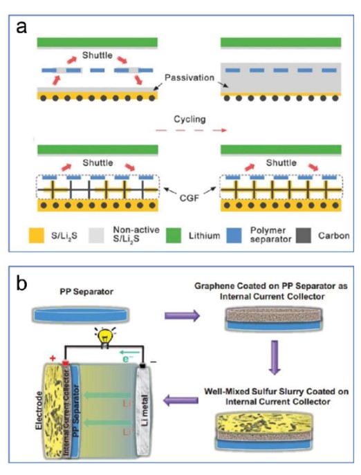 导电性材料如碳纳米管、石墨烯等作为隔膜涂层可在正极-隔膜界面处构建优异的三维导电网络。这层嵌入的次级集流体可以有效活化隔膜上捕获的PSs/PSes,以及界面累积的钝化层(如Li2S),降低界面电阻。将硫浆料直接涂覆在具有导电涂层的功能隔膜上替代传统的“隔膜+S+集流体”模式,可大幅提升电池体系的能量密度。此外,界面处的离子传导动力学也可以通过优化隔膜-电解液相互作用而被促进。