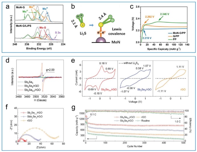 图7. (a, b) MoN-G/PP隔膜与LiPSs的化学相互作用; (c)基于PP, G/PP, MoN-G/PP隔膜的锂硫电池充电曲线; (d) Sb2Se3, Sb2Se3/rGO, 及Sb2Se3−x/rGO的EPR谱图; (e, f) 基于Sb2Se3, Sb2Se3/rGO, 及Sb2Se3−x/rGO修饰隔膜的对称电池的CV及阻抗图; (g) 基于Sb2Se3, Sb2Se3/rGO, 及Sb2Se3−x/rGO修饰隔膜的锂硫电池性能对比。