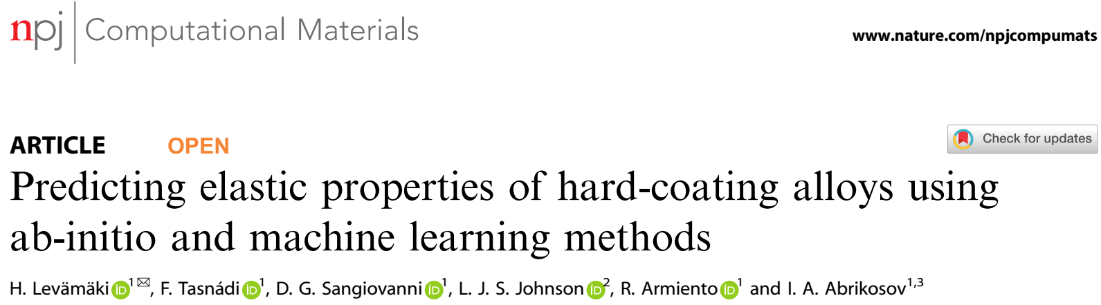 近日,瑞典林雪平大学和俄罗斯国立HTH官网地址 大学在npj Comput. Mater.上发表文章,题为“Predicting elastic properties of hard-coating alloys using ab-initio and machine learning methods”。该工作利用密度泛函理论和机器学习,建立了硬质涂层材料数据库,开发了自动化高通量工作流,获得决定硬质涂层性质的关键参数,并发展理论预测模型。主要工作如下: