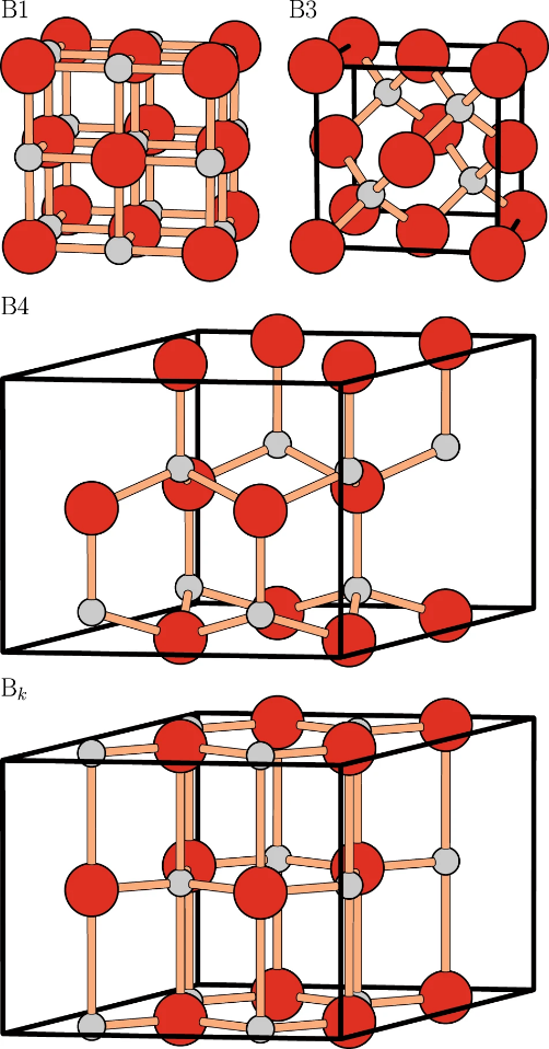 图 2 B1,B3,B4和Bk有序氮化物结构球棍模型。红色代表金属原子,灰色代表氮原子。