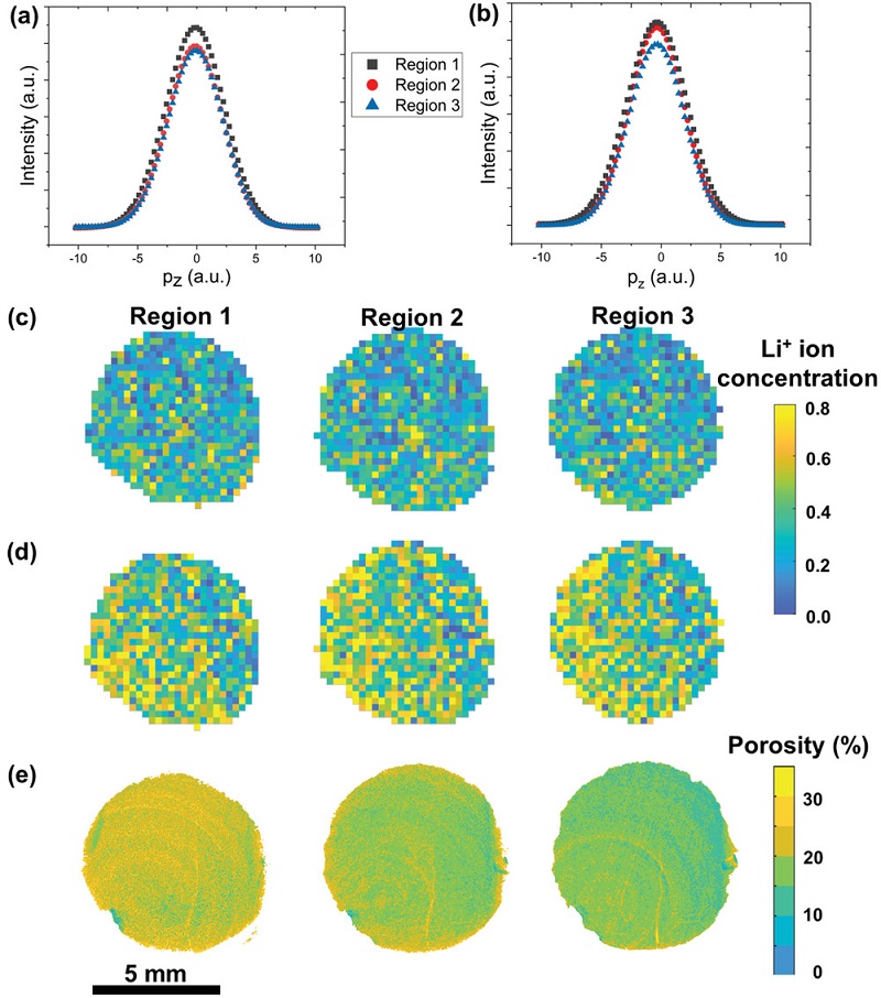由于锂具有最低的原子序数(Z)之一,因此在纽扣电池等典型电池中检测埋在正极材料的高Z元素中的锂的化学成分极具挑战性。虽然电极活性材料中锂离子化学计量的变化引起的原子或原子总电子密度的变化很小,但可以从X射线的康普顿散射(XCS)中获得电极活性材料的价电子的电子动量。然而,之前的XCS实验通过逐个像素地扫描电池上的X射线笔形光束来获得信号,这非常耗时,并且电池化学成分可能在感兴趣区域的扫描完成之前已发生了变化。此外,上述方法没有显示电极物理微观结构,因此锂化学成分与电极微观结构之间的关系仍然难以捉摸。
