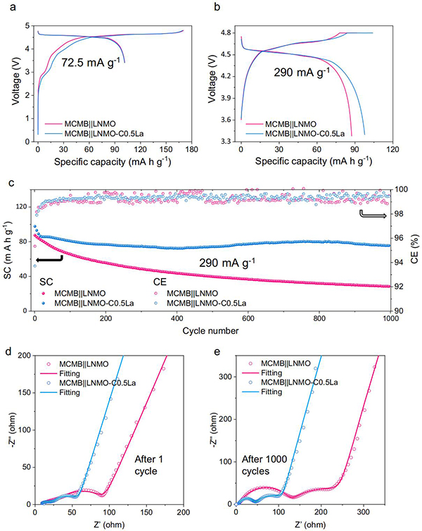 图五、MCMB||LNMO和MCMB||LNMO-C0.5La全电池在26°C下的电化学性能(a)在72.5 mA g–1下,全电池的初始充放电曲线;