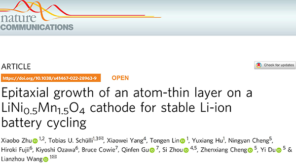 文献链接:“Epitaxial growth of an atom-thin layer on a LiNi0.5Mn1.5O4 cathode for stable Li-ion battery cycling”(Nature Commun.,2022,10.1038/s41467-022-28963-9)