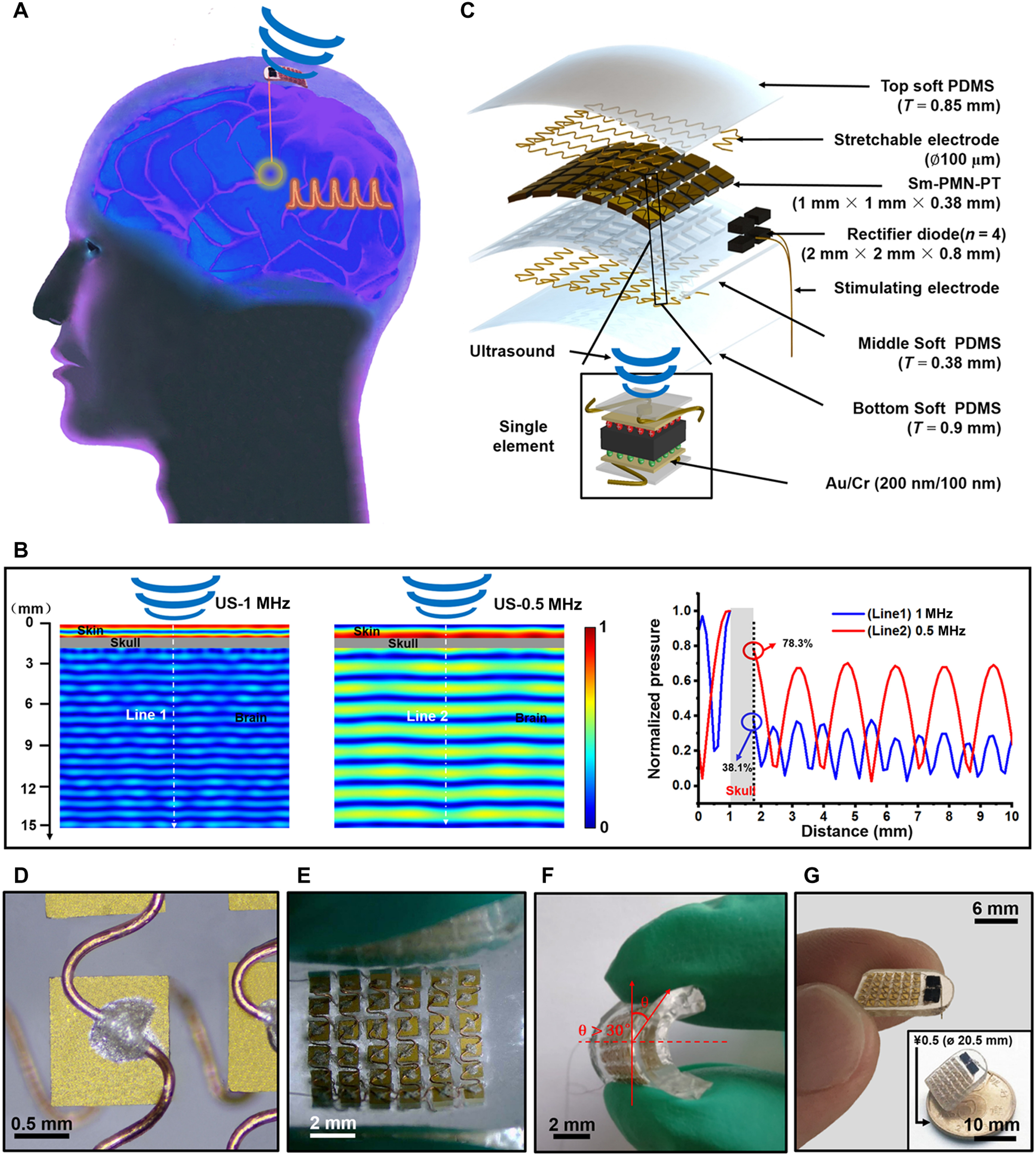 近日,西安交通大学李飞和华中HTH官网地址 大学朱本鹏(共同作者),联合在Science Advances上发表文章,题为“Piezoelectric ultrasound energy–harvesting device for deep brain stimulation and analgesia applications”。作者利用高性能Sm掺杂PMN-PT压电单晶,设计并制备出6×6阵元、柔性植入式压电超声能量收集器件(Sm掺杂piezoelectric US energy–harvesting, Sm-PUEH);该器件在1 MHz超声驱动下,可产生高达1.1 W/cm2的瞬时输出功率和4270±40 nW的平均充电功率,远高于之前的记录值(60 mW/cm2,160 nW);当Sm-PUEH被植入大鼠头部后,电生理与行为学实验结果表明,该器件可实现超声驱动的深脑电刺激,成功调节PAG脑区神经活动,并获得很好疼痛抑制效果。该研究为深脑刺激和疼痛抑制技术提供了新策略,并为生物医学植入式器件能源供给提供了新思路。