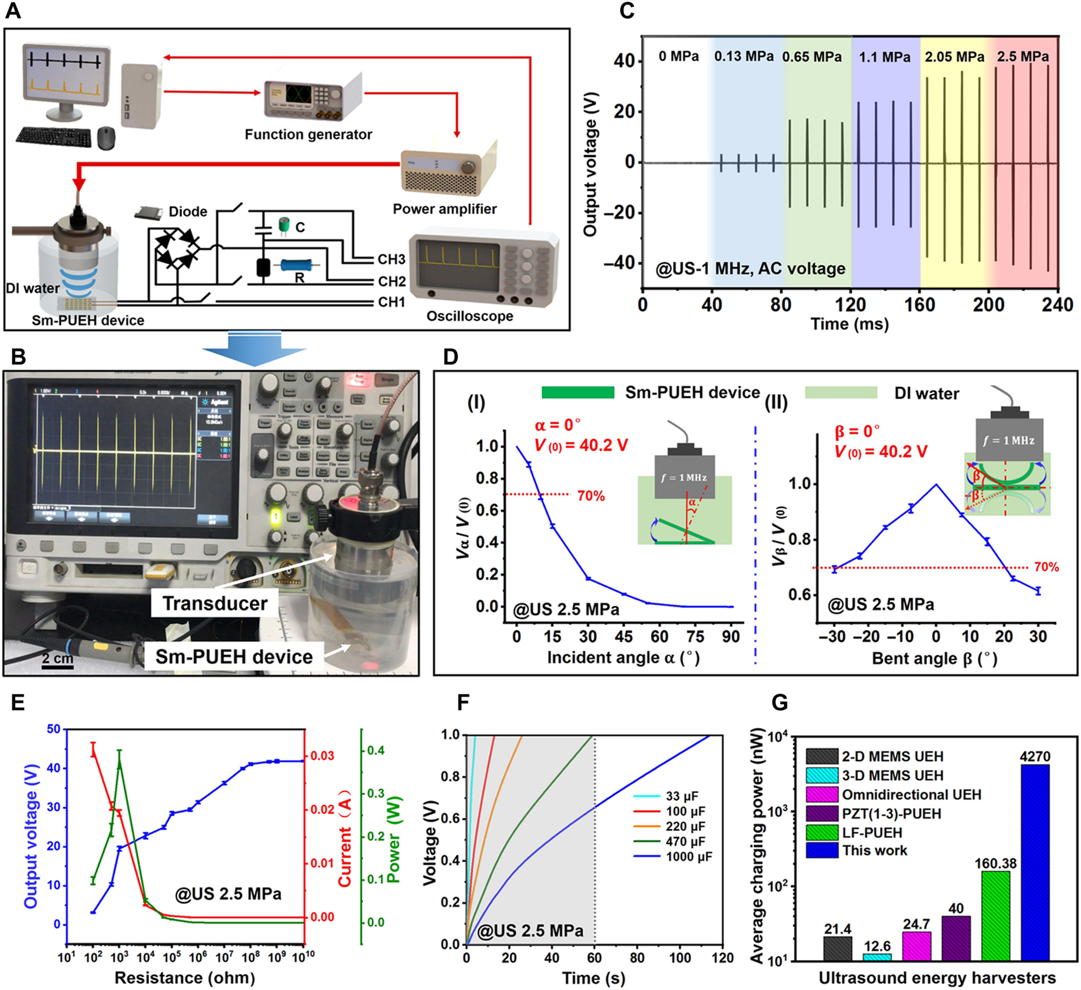 1. 柔性植入式压电超声能量收集器件在1 MHz超声驱动下,可产生高达1.1 W/cm2的瞬时输出功率和4270±40 nW的平均充电功率,远高于之前的记录值(60 mW/cm2,160 nW)
