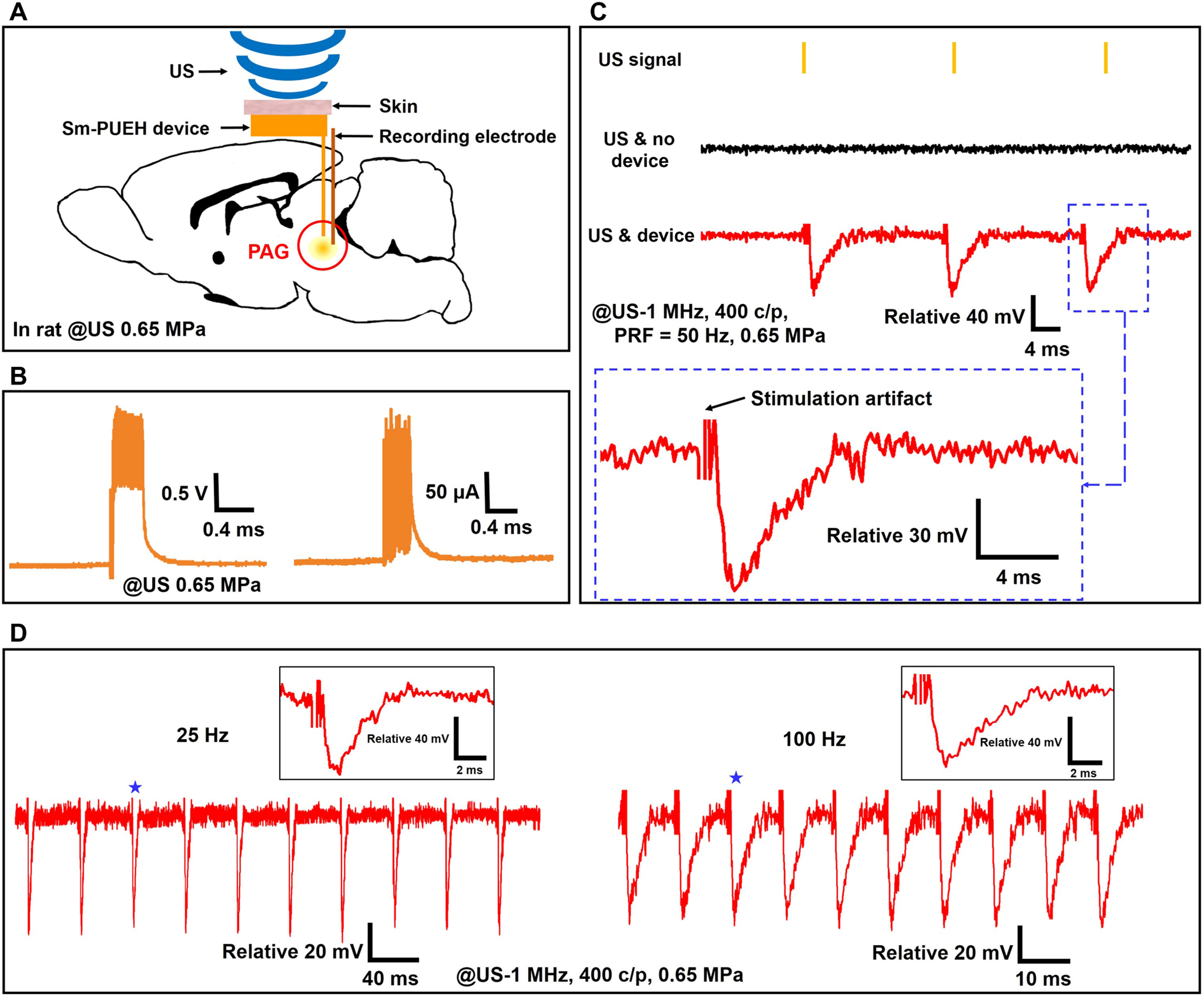 2. 当Sm-PUEH被植入大鼠头部后,电生理与行为学实验结果表明,该器件可实现超声驱动的深脑电刺激,成功调节PAG脑区神经活动,并获得很好疼痛抑制效果