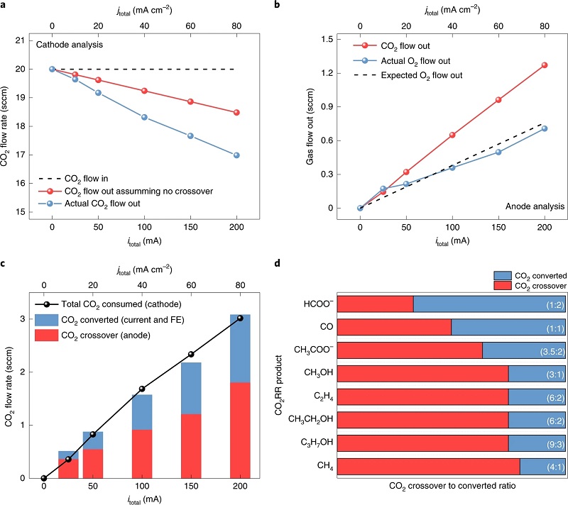 (c)CO2流量分析,显示交叉CO2和转化的CO2,加起来匹配阴极侧的总CO2流量变化;