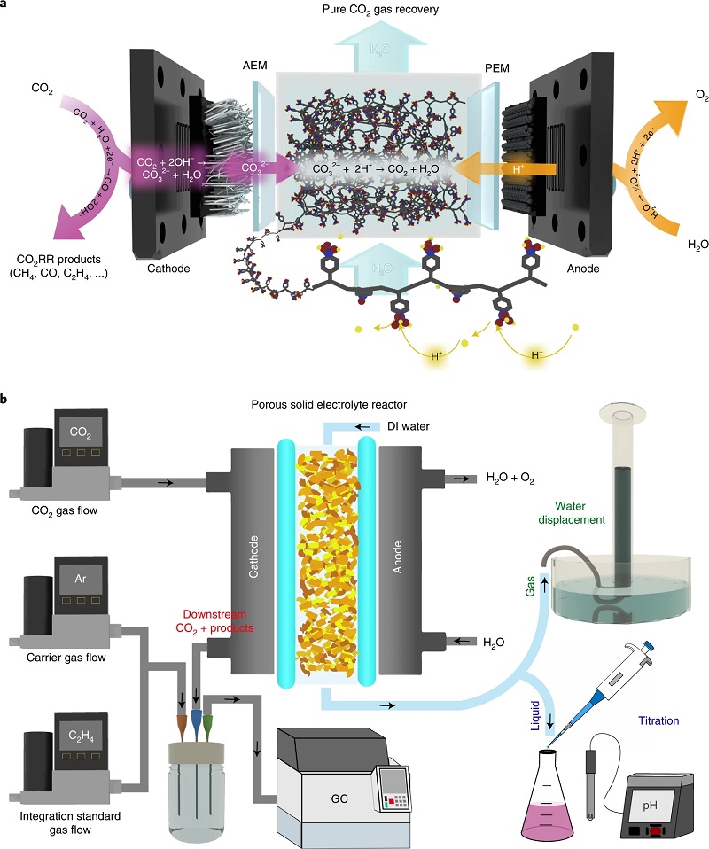 近日,美国莱斯大学汪淏田教授(通讯作者)等人报道了一种多孔固体电解质(porous solid electrolyte, PSE)反应器,以有效的实现了在CO2RR电解过程中交叉CO2的高效回收。通过在阴极和阳极之间形成可渗透的离子传导磺化聚合物电解质作为缓冲层,交叉碳酸盐(CO32-)可以与阳极OER产生的质子(H+)结合,重新形成CO2气体,同时利用去离子水连续冲洗PSE缓冲层,可以很容易地重新捕获CO2气体以重复使用,而无需与阳极O2混合。此外,作者使用银纳米线(Ag NWs)催化剂作为模型,将CO2还原为CO,能够以超高纯度形式(气体纯度超过99%)实现回收率高达90%的交叉CO2气体,同时在200 mA cm-2电流密度下可以提供超过90%的CO法拉第效率(FE)。此外,作者还证明了用于交叉CO2回收的PSE反应器可以成功地扩展到不同的CO2RR催化剂和产品。将这些回收的CO2再循环回输入流中,在100 mA cm-2电流密度下获得超过90%的连续CO2转化效率。研究成果以题为“Recovering carbon losses in CO2 electrolysis using a solid electrolyte reactor”发布在国际著名期刊Nature Catalysis上。