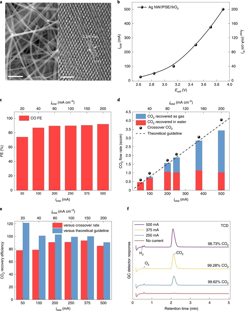 2、利用Ag NWs催化剂将CO2还原为CO,以气体纯度超过99%形式实现回收率高达90%的交叉CO2气体,同时在200 mA cm-2下可提供超过90%的CO法拉第效率(FE)。