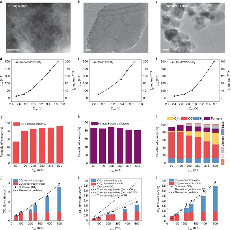 (g-i)CO、甲酸盐和七种不同的CO2RR产物FE分别在Ni-SAC、2D-Bi和Cu NPs的固体电解质反应器中进行电化学测试;