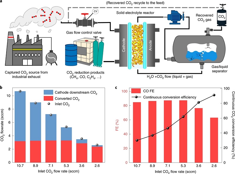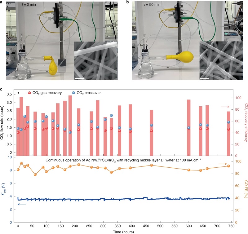 (c)CO FE和Ag NW在具有CO2回收系统的固体电解质中的连续转化。