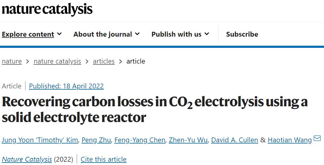 文献链接:Recovering carbon losses in CO2 electrolysis using a solid electrolyte reactor. Nature Catalysis, 2022, DOI: 10.1038/s41929-022-00763-w.