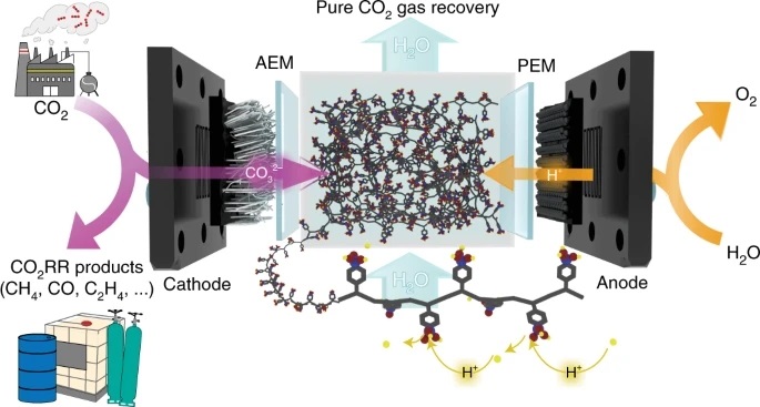 (a)PSE反应器中CO2RR的示意图以及通过与PSE缓冲层中的质子复合来回收交叉CO32-离子的过程;