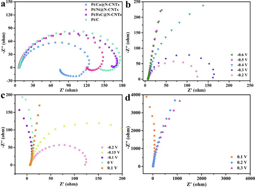 图7 (a) Pt/M@N-CNTs (M = Co, Ni和Fe3C)在1 M KOH + 1 M CH3OH溶液−0.2 V处的Nyquist图。(b-d) Pt/Co@N-CNTs在1 M KOH + 1 M CH3OH溶液中的Nyquist图,电极电位为−0.6 V至0.3 V。