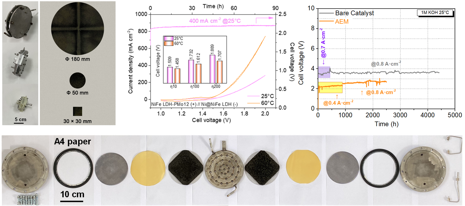 图4. (左)电极规模化制备。(右)AEM性能及稳定性测试。