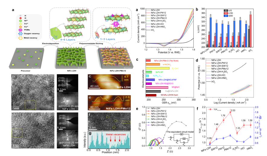 针对上述问题,中国科学院上海硅酸盐研究所王平副研究员、王现英研究员等提出了一种杂多酸(POMs)湿法蚀刻-抛光制备兼具高OER活性和高稳定性NiFe LDH电极的新工艺方法。该方法巧妙地利用POMs多功能特性——超强酸性、强氧化还原性及丰富阴离子簇结构,实现了对NiFe LDH三维结构、Ni和Fe活性相比例、氧空位浓度及POMs阴离子簇插层与表面吸附的多维度调控。结合系统表征分析和理论计算,揭示了OER性能的关键影响因素及其多重协同机制,为该类材料OER性能的阶梯式提高提供了新的思路。