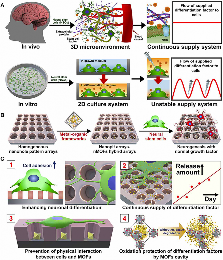 近日,韩国中央大学Tae-Hyung Kim教授和韩国淑明女子大学Kyung Min Choi等人合作,以“Single metal-organic framework–embedded nanopit arrays: A new way to control neural stem cell differentiation”为题在Science Advances期刊上发表重要研究成果。作者使用单一金属-有机框架(MOF)纳米粒子——嵌入纳米阵列(SMENA),可以高效地生成神经干细胞。通过优化均匀周期性纳米形态的物理参数,每个纳米图可以限制单一的nMOFs (UiO-67),这些nMOFs是专为维甲酸(RA)的长期存储和释放而设计的。SMENA方法成功地抑制了与细胞的物理相互作用,这有助于nMOF (RA⊂UiO-67)结构的显著稳定性,而不诱导纳米颗粒介导的毒性问题。由于RA的持续和长期供应,神经干细胞的各种神经发生相关活动的mRNA表达增强。作者开发的SMENA方法也可以应用于其他干细胞来源和分化谱系,因此可用于各种基于干细胞的再生疗法。