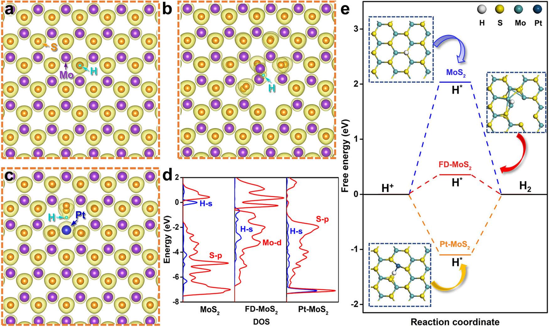 图4 单层原始MoS 2、FD-MoS 2和Pt-MoS 2的表面电荷密度分布和HER催化活性的DFT计算结果 © 2022 The Authors