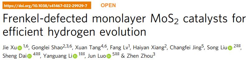 - 通过理论计算更深入地揭示了Frenkel缺陷的单层MoS2催化剂高效析氢的机理。