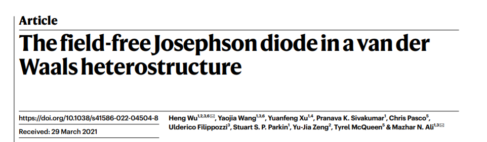 参考文献:Wu, H., Wang, Y., Xu, Y. et al. The field-free Josephson diode in a van der Waals heterostructure. Nature 604, 653–656 (2022). https://doi.org/10.1038/s41586-022-04504-8