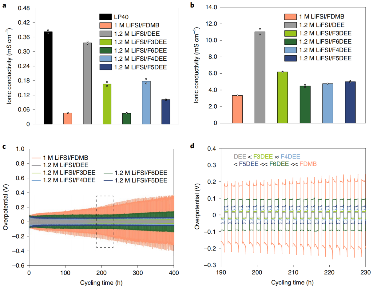 图二、FDMB和氟化DEE电解液的离子电导率和循环过电位