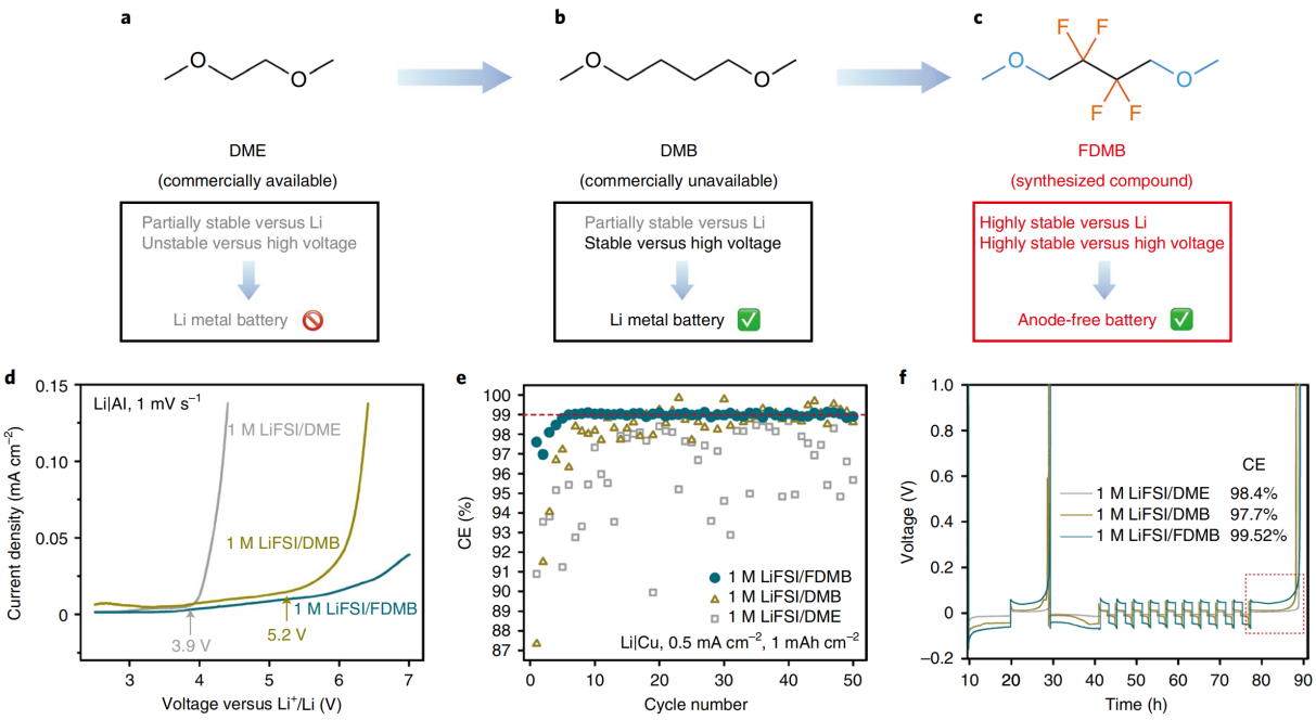 美国斯坦福大学崔屹教授和鲍哲南教授(通讯作者),俞之奡、王瀚森(共同一作)等人提出了一种电解液设计策略,从商业化的乙二醇二甲醚(DME)为出发点,延长烷基链以获得和1,4-二甲氧基丁烷(DMB),较长烷基链的稳健性能够同时保持溶剂化和传导锂离子的能力。其次,引入-F基团以进一步扩大氧化窗口和锂金属相容性,且只有当-F基团远离-O-基团时,才能保持醚的溶剂化能力。因此,只有DMB主链的中心部分被-CF2-取代,而-O-仍与CH3-和-CH2-相连得到的氟化1,4-二甲氧基丁烷(FDMB)对锂金属负极和高压正极都是稳定的,从而使无负极锂金属电池能够在标准浓度的单盐单溶剂中电解液中稳定循环。相关研究成果以“Molecular design for electrolyte solvents enabling energy-dense and long-cycling lithium metal batteries”为题发表在Nature Energy上。