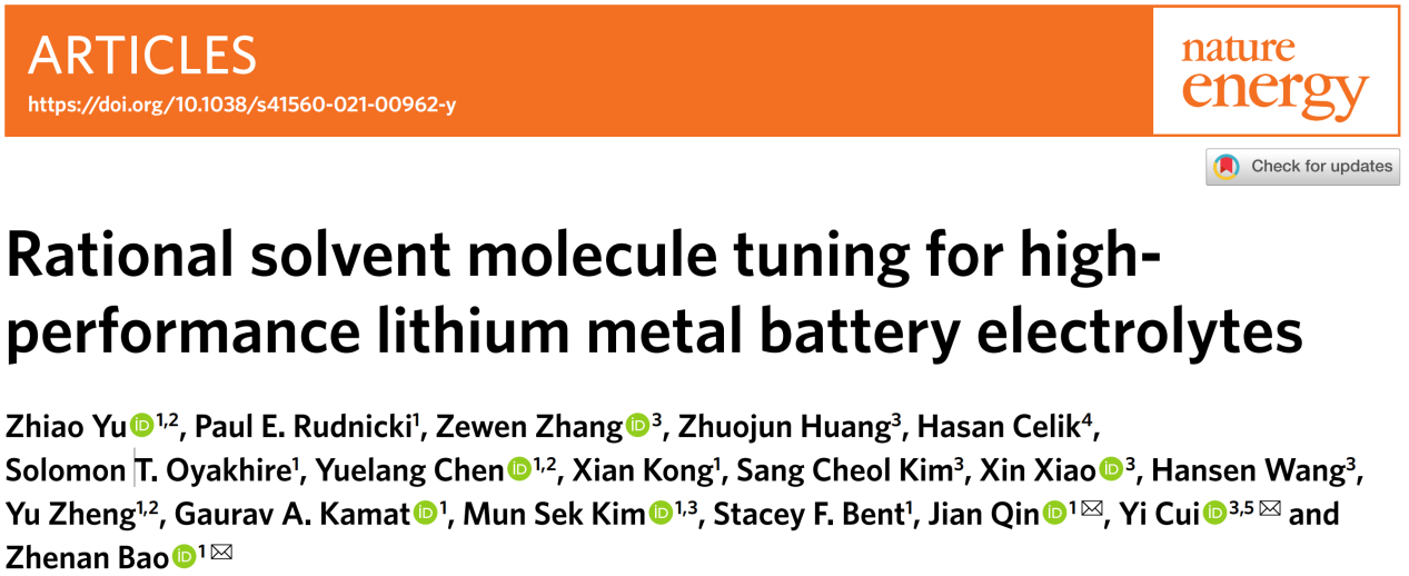 2.Yu, Z., Rudnicki, P.E., Zhang, Z. et al. Rational solvent molecule tuning for high-performance lithium metal battery electrolytes. Nat. Energy 7, 94-106 (2022). https://doi.org/10.1038/s41560-021-00962-y