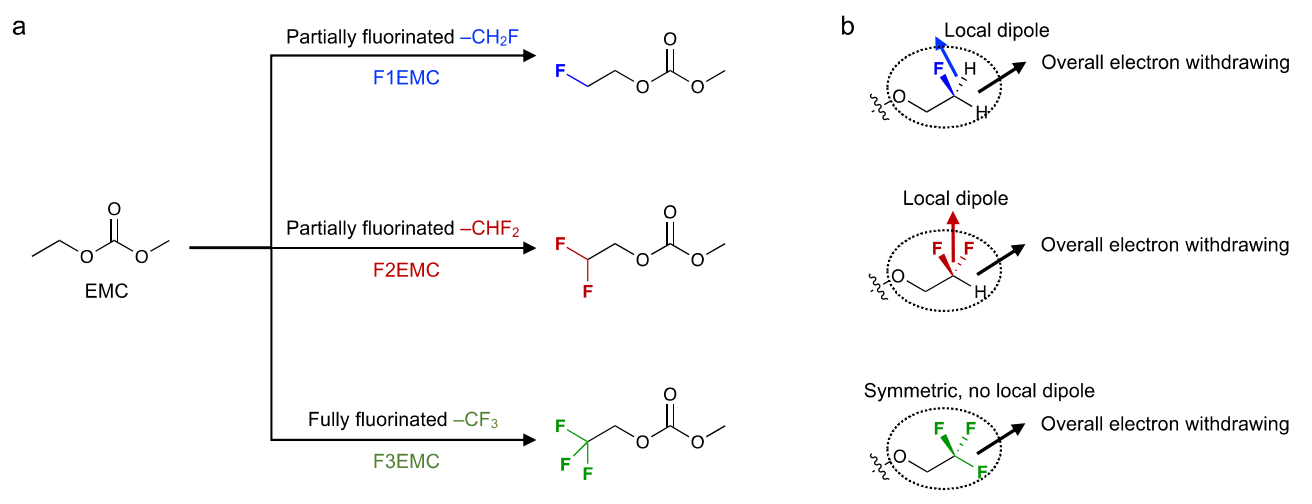俞之奡博士:我觉得情况非常类似。过度的氟化对于分子介电常数、导离子率、溶剂化能力等等方面,都不一定是最好的选择。其实锂离子电池业界也很早就已经意识到,DFEC并不如FEC有效;而我们想做的其实是去探讨线性碳酸酯是不是也有这种微调的可能。F3EMC其实很多公司都已经商业化、量产了,也有很多学术界工作或者业界已经把它作为高压锂电池的溶剂之一或者添加剂。但我一直就在思考:F3EMC真的是最好的么?囿于我有限的学识,我确实没有见到非常系统的工作来研究氟化程度对线性碳酸酯在不同种类锂电池中的性能的影响(有一些零散的相关工作我已经引用在我J. Electrochem. Soc.的文章中了)。所以我就尝试设计合成F1EMC和F2EMC,看看他们是不是会比F3EMC好。我认为类似的情况也可能发生在别的溶剂中,当然了,还是应该具体情况具体分析。