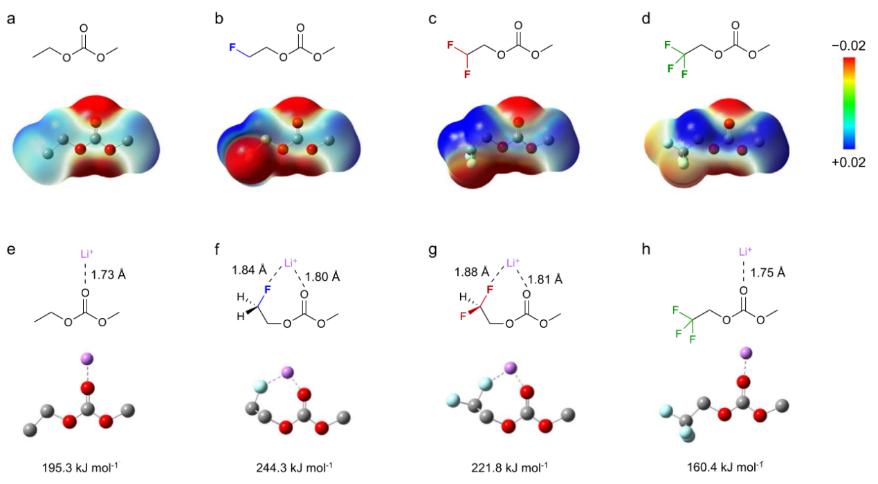 - 有实验报道,随着氟化程度的升高(如EC,FEC,DFEC),锂离子去溶剂化能力更强,电池性能会有一定程度的升高,这与本文中研究的F1EMC,F2EMC,F3EMC溶剂的氟化性能规律是否有相似之处?对于其他溶剂的氟化,是否有类似的“高或完全氟化溶剂不一定是可取的”的事实存在?