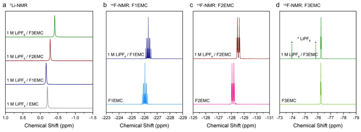图三、氟化EMCs和电解液的7Li-和19F-NMR