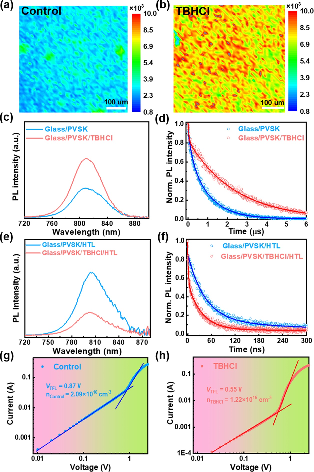 图 3. (a)对照和(b)TBHCl钙钛矿薄膜的PL mapping图。(c)对照和TBHCl的钙钛矿薄膜的SSPL和(d)TRPL光谱图。(e)Glass/perovskite/不含或含TBHCl/Spiro-OMeTAD的(e)SSPL和(f)TRPL光谱图。基于ITO/ perovskite(g)不含或(h)含 TBHCl/Au的器件的暗I-V曲线。