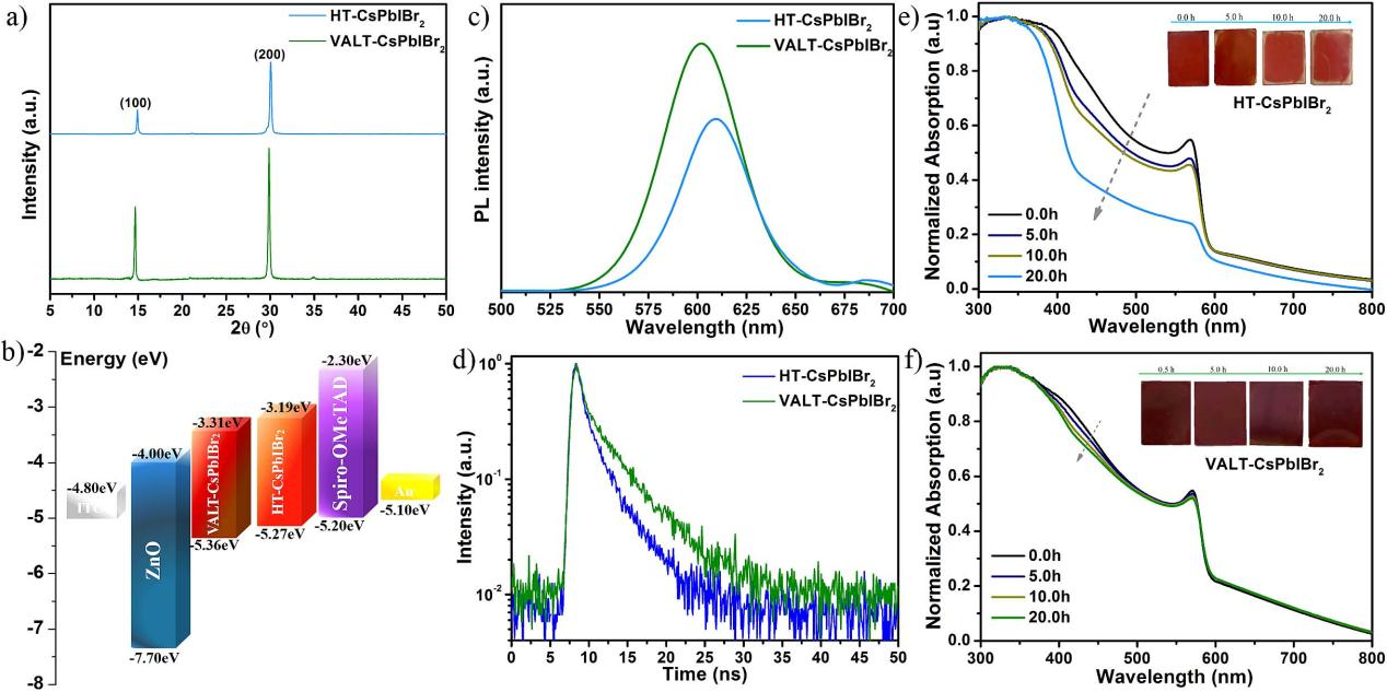 Figure 2. a) XRD patterns; b) energy level diagram of functional layers in PSCs of this work; c) steady PL spectra with quartz glasses as substrate; d) TRPL spectra with quartz glasses as substrate; e,f ) time dependence of absorption spectra in the ambient environment (25℃, 40–50% relative humidity), where two samples correspond to HT-CsPbIBr2 and VALT-CsPbIBr2, respectively.
