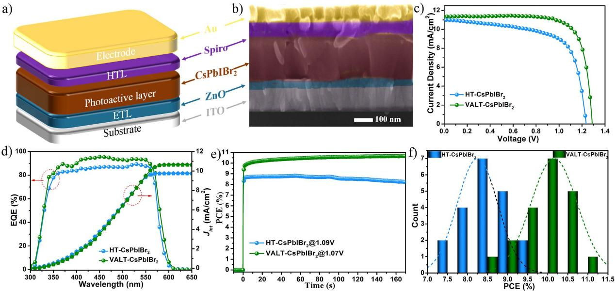 Figure 3. a) Schematic illustration and b) cross-sectional SEM image of VALT-CsPbIBr2 PSCs; c) J–V curves measured from the reverse direction, d) EQE spectra coupled with Jint, e) steady-state output of PCE at the maximum power point, and f ) statistical histogram of PCE from 20 individual HT-CsPbIBr2 PSCs and VALT-CsPbIBr2 PSCs, respectively.