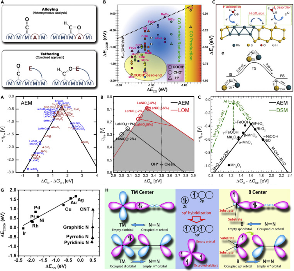 文章首先总结了理论计算方法与模型的发展,介绍了不同方法与模型的优势与缺点。其次,在理解实验方面,作者提出利用理论计算能够帮助确定活性中心原子结构、描述反应机理以及构建活性描述符以理解活性起源,并介绍了基于这些理解而取得的重要研究进展。在指导实验方面,文章结合一些研究结果,介绍了如何基于理论计算构建的“结构-性能”关系进行催化剂的理性设计,以及设计“突破固有线性关系限制”的高效催化剂的设计原则。此外,文章也介绍了利用高通量以及机器学习等技术手段从大量候选材料中来筛选高效电催化剂,以指导实验合成等方面的进展。
