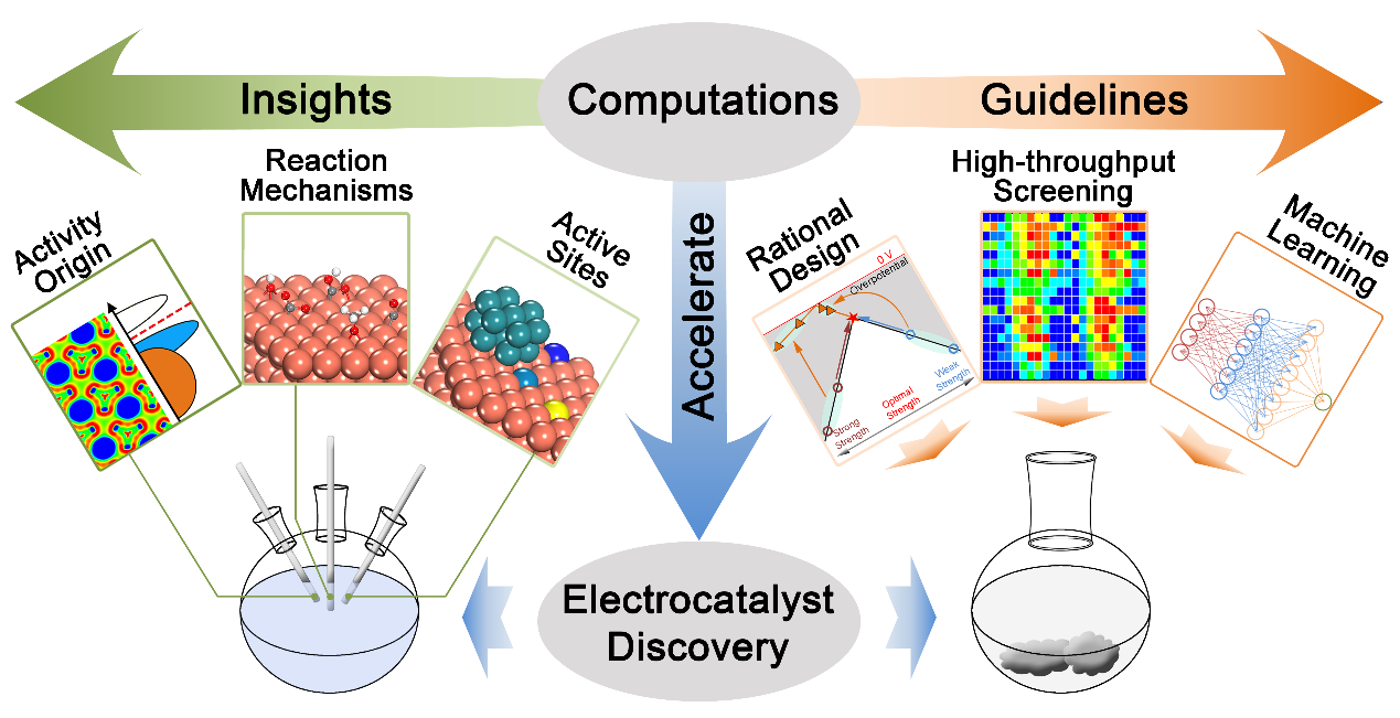 随着全球能源短缺以及环境问题的日益严峻,清洁能源的开发已是迫在眉睫。电化学能量转换,能够在电能驱动下、将空气中的小分子(H2O、CO2、N2等)转化为增值产物(H2、CxHyOz、NH3等),从而实现能源与重要化学原料的绿色、可持续生产,因此被视为解决当前能源短缺与环境问题的潜在方案之一。当前,缺少高效、稳定、价格低廉的电催化剂是限制这一技术实际应用的关键问题之一,因此电催化剂的研发一直是该领域研究的重点和难点。在过去的十几年中,电催化剂的研发取得了长足进步,而理论计算在这个过程中发挥着不可或缺的作用。有鉴于此,东南大学王金兰教授(通讯作者)、凌崇益副教授(第一作者)等人围绕“计算如何助力电催化剂研发”,结合团队前期的研究成果以及领域内一些经典例子,在Chem上发表综述论文“How computations accelerate electrocatalyst discovery”,从理解和指导实验两个方面,总结和介绍了理论计算在电催化剂发展过程中的重要作用。