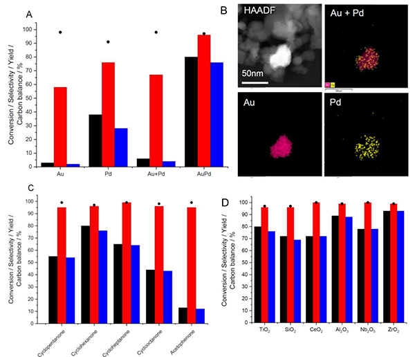 在这项工作中,研究者证明了AuPd合金与钛硅分子筛(TS-1)作为双功能催化剂的核心作用:优化金属比例与载量的AuPd合金能够有效的在加热和弱碱性环境下生成H2O2,而TS-1可以有效利用原位生成的H2O2完成氨氧化反应。单组分Au对于该反应没有催化活性,单组分Pd显示一定的转化率但是比较低的选择性,简单物理混合的催化剂也没有催化活性,但是一旦形成AuPd合金之后,反应活性得到了极大的提升。负载AuPd合金有着优异的催化H2/O2生成H2O2的催化活性,但是没有氨氧化催化能力;而TS-1在使用商业H2O2溶液作为氧化剂的时候能够催化生成环己酮肟,但是选择性较差。两种催化剂的简单物理混合却得到了非常优异的催化表现,这证明可以利用原位生成H2O2的方式来高效,方便的完成这种重要聚合物单体的催化制备。
