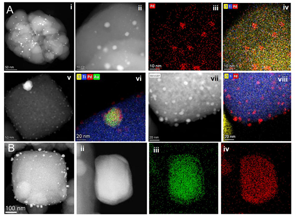 研究者进一步利用浸渍法直接将AuPd合金负载在TS-1载体上。利用透射电镜,他们发现一个非常有趣的现象:TS-1催化剂里存在有两种成分,绝大多数TS-1颗粒成分以氧化硅为主,但是存在有少量的富钛氧化物颗粒。负载贵金属催化剂具有明显的二元分布,AuPd合金主要存在于富钛氧化物上,而在富硅颗粒上存在有许多金属Pd小颗粒。实验证明小的Pd颗粒对于原位H2O2生成和氨氧化反应没有催化活性,而且会在反应过程中浸出导致贵金属的损失,但是AuPd合金纳米颗粒能够牢固的附着在氧化物载体上,经过长时间使用或者多次使用其结构和成分都没有发生变化,这也证明这种稳定的催化剂具有良好的工业应用前景。
