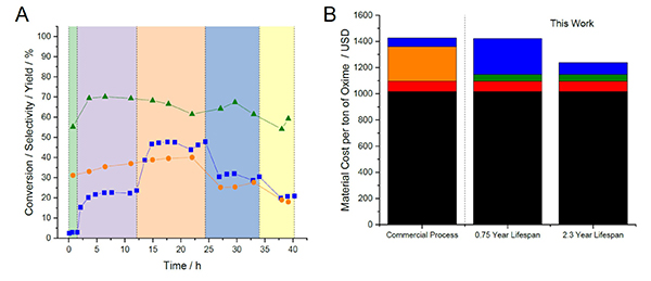 为了验证其工业实用性,研究者设计了特别的固定流化床反应装置去评估催化剂在类工业设备下的反应活性和寿命。实验证明结果40小时或者250小时的长时间实验,催化活性一直保持稳定,没有明显的下降。与日本宇部兴产(UBE Corporation,尼龙的主要生产商之一)进行合作,研究者对这个催化体系进行经济评估,发现如果贵金属的催化寿命如果只有0.75年,原位生成H2O2制备环己酮肟的成本与现有工业生产成本接近,如果催化剂寿命延长至2.3年,其制备成本相比现有工业成本下降13%。这个经济评估还没有考虑到节约的有关非原位制备H2O2及运输,稀释等过程所带来的额外成本。考虑到反应的高转化率,高选择性,低副产物的生成,高H2和NH3的利用率,整个生产过程更加可持续和环保。研究者通过先进的催化剂设计,详尽的实验以及充分的微观结构表征,第一次成功的将原位H2O2合成与现有化工品生产进行结合,在科学上和技术上证明利用原位H2O2合成实现绿色化工新路线的可行性与经济性。