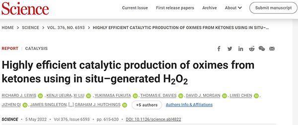 文献链接:“Highly efficient catalytic production of oximes from ketones using in situ–generated H2O2”(Science,2022,10.1126/science.abl4822)