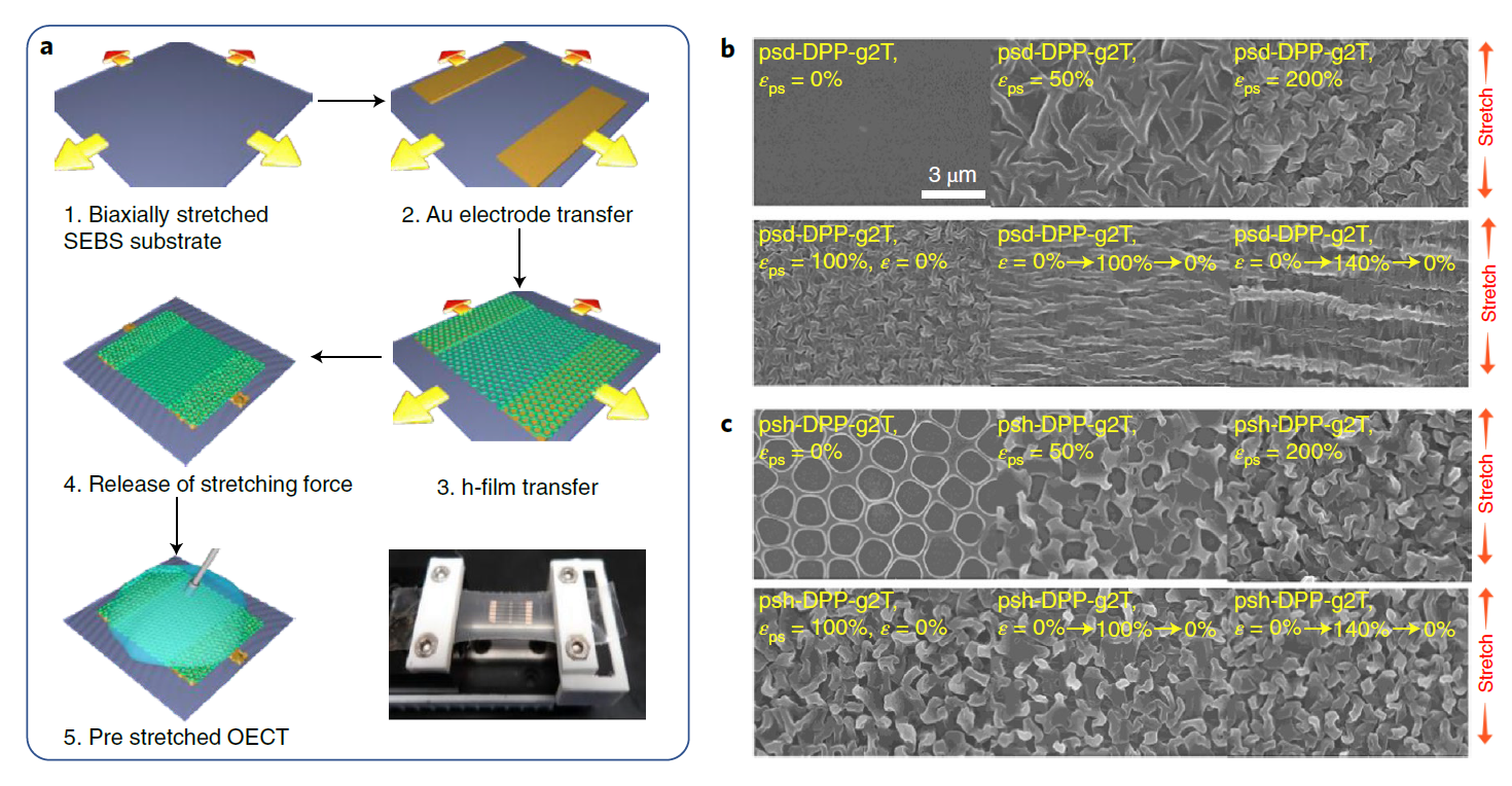 图3. a) psd-和psh-DPP-g2T的制备过程。b)上图为psd -DPP-g2T在不同预拉伸(εpr)后的SEM;下图为psd -DPP-g2在不同预拉伸(εpr)后,不同拉伸状态下(ε)的SEM。c)上图为psh -DPP-g2T在不同预拉伸(εpr)后的SEM;下图为psd -DPP-g2在不同预拉伸(εpr)后,一次100%或140%应变循环后的SEM。