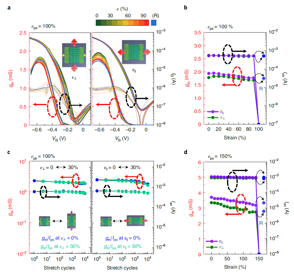 图4. psh-DPP-g2T电化学晶体管预拉伸100%应变后,在横向和纵向不同应变下的a)源漏电流、跨导与门电压、应变的关系;b)跨导和源漏电流与应变的关系;c)跨导和源漏电流与循环次数的关系。d)psh-DPP-g2T电化学晶体管预拉伸150%应变后,跨导和源漏电流与应变的关系。