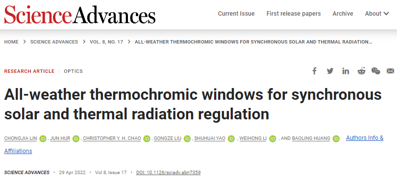 参考文献:Lin, C., Hur, J., Chao, C. Y., Liu, G., Yao, S., Li, W., & Huang, B. (2022). All-weather thermochromic windows for synchronous solar and thermal radiation regulation. Science Advances, 8(17), eabn7359.