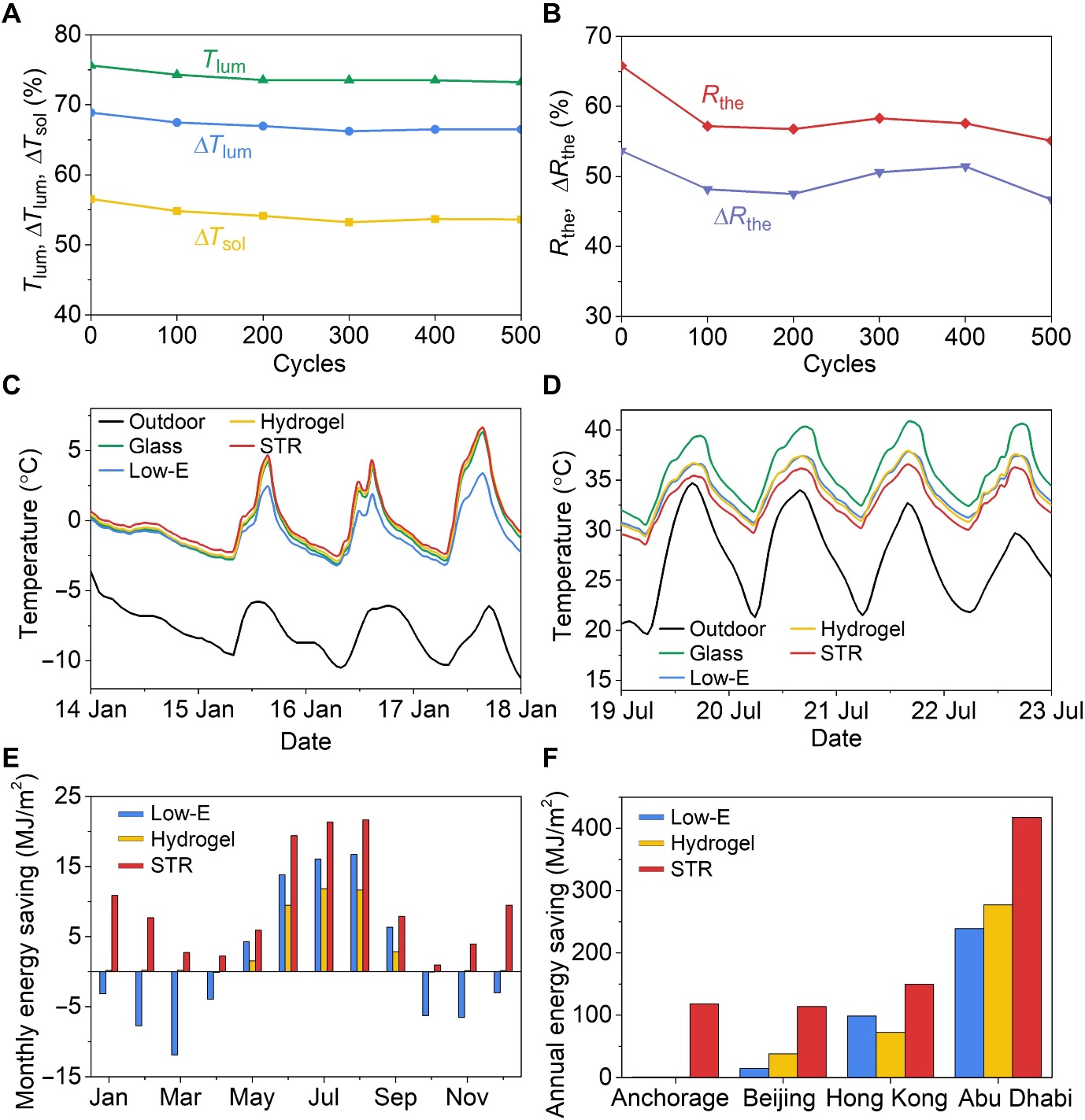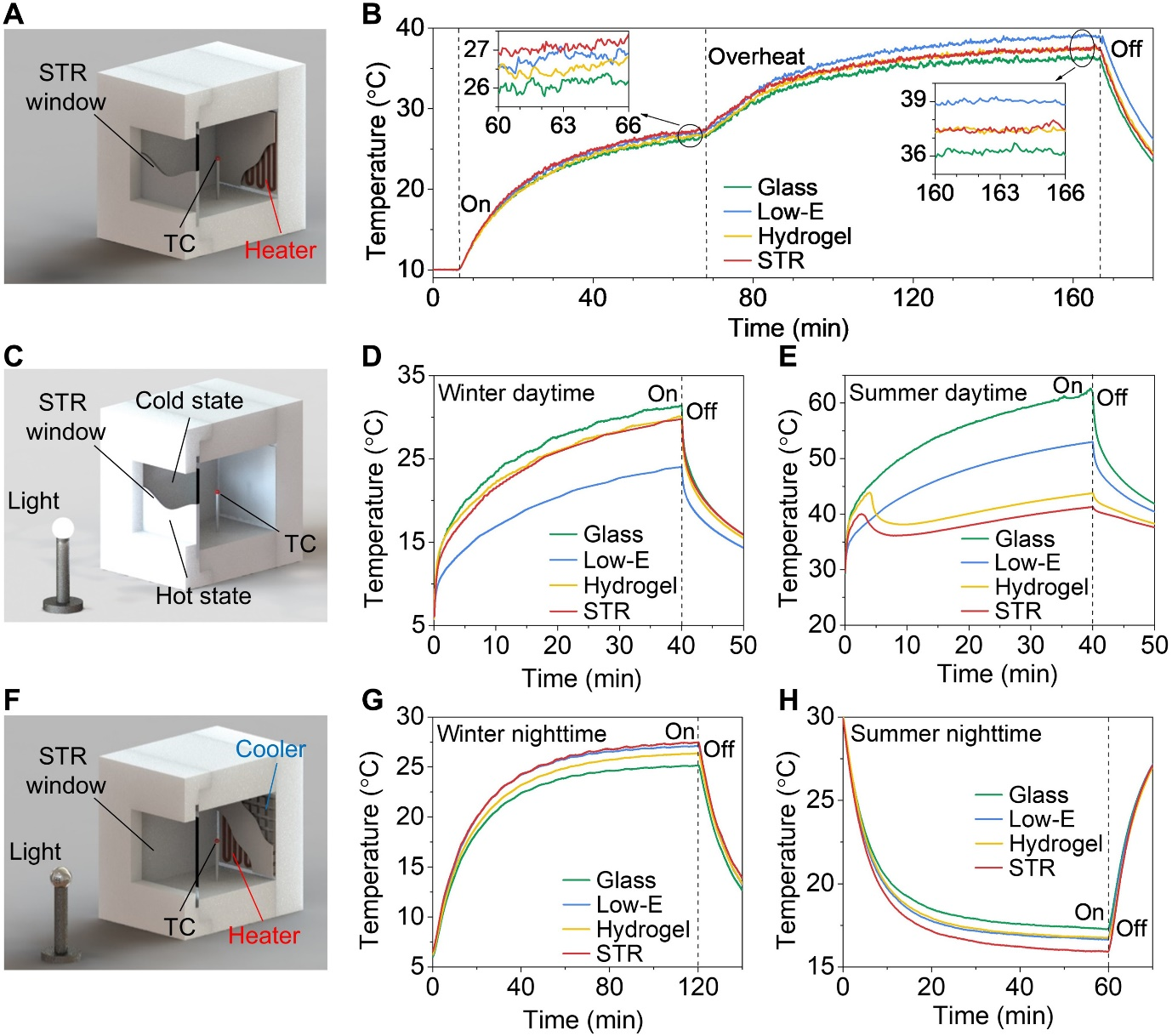 近日,香港HTH官网地址 大学黄宝陵教授、姚舒怀教授和香港城市大学李威宏教授(共同通讯)联合在国际著名期刊Science Advances上发表文章,题为“All-weather thermochromic windows for synchronous solar and thermal radiation regulation”。第一作者为香港HTH官网地址 大学博士后研究员林崇佳,共同一作为硕士生Jun Hur。研究团队首次利用水凝胶(pNIPAm)的热致水捕获和释放特性,利用水分子作为远红外热辐射调节剂,水凝胶为太阳辐射调控材料,并结合银纳米线的热反射性能,获得了拥有58.4%太阳辐射调控和57.1%远红外热辐射调控能力的热致变色智能窗(STR窗户)。此STR窗户在寒冷环境下,可透过大量的太阳光能,提高室内温度,同时反射大部分室内热辐射,防止热能外泄,达到突出的取暖保暖效果;在炎热环境下,可反射大部分太阳光能,降低室内的热荷载,同时吸收室内的热辐射并发射至室外,促进室内散热,达到优异的降温效果。室温测试和模拟计算均表明,此新型智能窗户相比于现有的节能窗户,其超宽光谱的自动调节能力,使其拥有更强的气候适用性,可于不同地区均实现显著的节能效益。