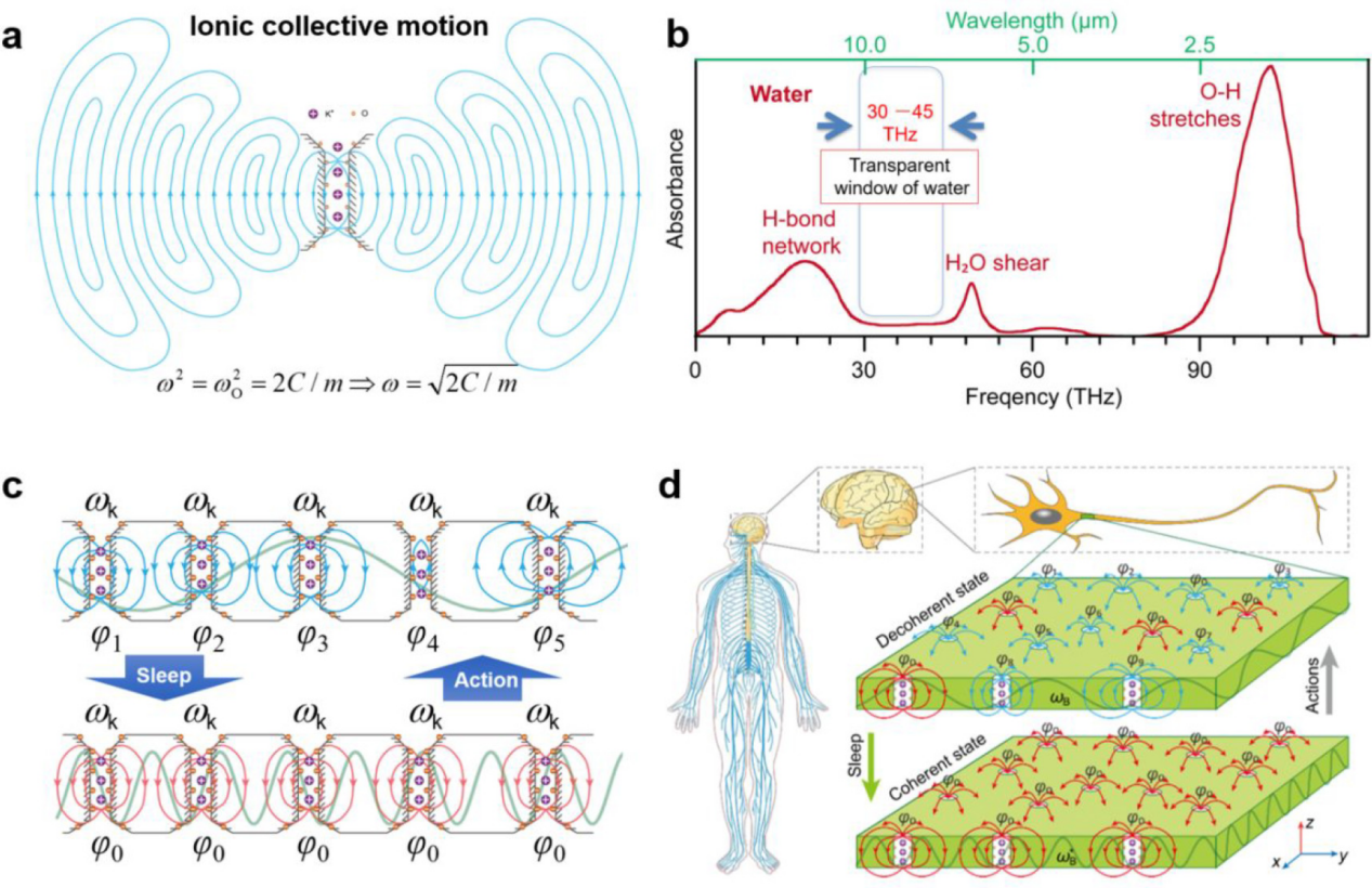 电鳗身体的摆动和心脏复苏是机械能向电能的转换,机械调制可能导致离子的集团运动,即离子相干共振的宏观量子态。心肌细胞内Ca2+的相干共振可以诱发心跳,实现生物系统从电能到机械能的转换。离子通道的宏观量子态被认为是神经信息的载体,环境场可能在调节各种离子通道的宏观量子态方面发挥重要作用。在生物离子通道系统中,离子通道与它们所释放的光子之间的耦合可以产生环境波,环境波又可以将通道中的离子振荡调节到相干状态。退相干和相干的状态可能对应于睡眠和行为的状态。