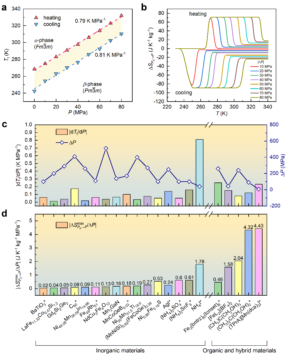 图1. NH4I的相变温度压力敏感性、饱和可逆驱动压力和压卡强度等与其它压卡材料的对比。